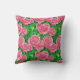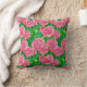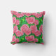 Kissen in Aquarellfarben, in tiefgründigen Fuchsientönen bis in Pastellrosa, vor einem Hintergrund von grünen Blätter