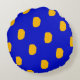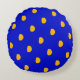 Dieses Kissen zeigt ein Muster von kleinen abgerundeten gelben Pinselstrichen in Orange polka Punkte auf einem blauen Hintergrund.