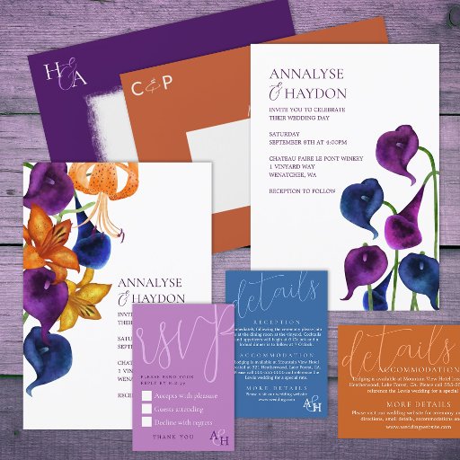 Die lila Calla Lilien in Blau und Pflaume laden zum Verweilen im Herbst ein. Frische Einladungen für die Clublilie sind für alle Jahreszeiten wunderschön. Dieses moody calla lily Design ist vielseitig für königsblau, marineblau, indigo, dunkel lila, merlot, & plum Hochzeitsfarben.