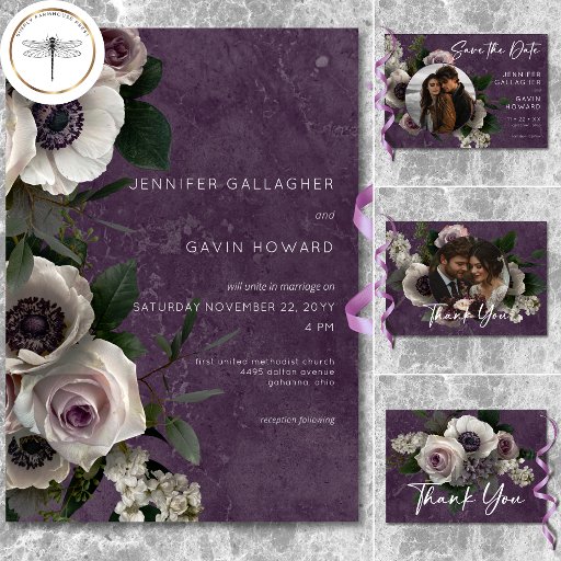 Diese exquisite Hochzeit bewahrt die Dattelkarte mit dem Foto-Design und besticht durch ein fesselndes Spray aus blassem Lavendel, weiß, grün und blassrosa Anemonen und Rose, die kunstvoll auf einem luxuriösen lila pflaumenfarbenen Hintergrund mit sanftem Marmoreffekt angeordnet sind. Die gepflegte, moderne weiße Typografie verleiht dieser Touch Eleganz und ist somit die ideale Wahl für eine romantische Hochzeit. Ihr Lieblings-Foto rundet das Aussehen ab. Erstellt von der einfachen Farmhouse Press.