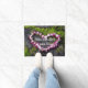 Kommen Sie mit Liebe in Ihre Herz Plumeria-Blumenfußmatte herein. Leu einer formten schöne Blume als Herz, das auf die Lavafelsen gesetzt wurde.