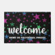 Farbenfrohe Imitate Glitzer Sterne Pop vor dem eleganten schwarzen Hintergrund. Warme rosa, grüne und rot gefärbte Streifen heißen Sie willkommen in Ihrem Zuhause, Business oder Klassenzimmer. Fett weißer Text lautet "willkommen". Aktualisieren Sie einfach den Lehrer, Familiennamen oder Klassentitel. Vielleicht gibt es genug Platz für einen niedlichen Witz? Es gehört dir, es anzupassen. Erhältlich in vielen anderen funkelnd Hintergrundfarben und Designs.