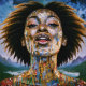 "Goldenes Soul, unendlicher Himmel". Eine strahlende afromoderne Frau, umgeben von goldenen und kosmischen Details, symbolisiert Kraft und spirituelle Transzendenz. Dieses Stück verbindet abstrakte und surreale Elemente und strahlt Inspiration und Positivität aus, wobei das Lächeln der Frau Hoffnung darstellt und innere Kraft für ein helleres, vereintes Morgen.
