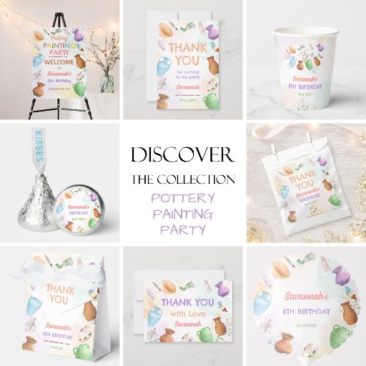 Soft pastel tones and hand-painted details give it a fun studio vibe while keeping it sweet and child-friendly. Personalize with your child’s name for a coordinated look that matches your pottery painting invitations, decor, and party supplies.