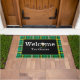 Erleben Sie Ihren Einstieg mit unserer bezaubernden, grünen und goldenen karierten personalisierten Willkommensmatte, bei der ein Golfball auf einem braunen Tee das O in Welcome ersetzt. Dress up your entryway mit einer Begrüßungstat zum Thema Golf. Das perfekte Geschenk für den begeisterten Golfer oder das 19. Loch Golfplatz Clubhaus.