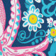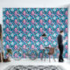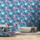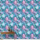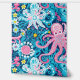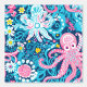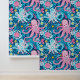 Ein nahtloses, von Hand gezeichnet Muster mit rosa und weißen Oktopusfarben, umgeben von weißen, blauen und gelben Blumen, Set gegen den tiefblauen Meeresboden. Das Design verbindet skurrile Meereslebewesen mit lebendigen Blumenelementen und schafft so eine charmante und lebendige Unterwasserszene.