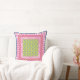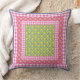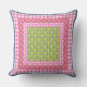 Ein schick gezogenes Kissen oder Kissen, mit einem hübschen Muster von dunkelrosa, violett-blauen und gelben Primaten auf grünem Hintergrund, gepaart mit tiefrosa und weißem Karo Gingham und einem Muster von gelben Primaten und grünen Polka Punkten auf tiefrosa Hintergrund; aus der Posh & Painterly "Primroses" Kollektion.