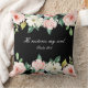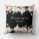 Ein Kissen mit inspirierender Zitat-Schrift zeigt ein wunderschönes, blumenfarbenes Aquarellbild mit weißen und rosa Rosen und Grünpflanzen auf schwarzem Hintergrund. Es zeigt einen Teil des geliebten Bibelverse-Psalms 23:3, "Er restauriert mein Soul."