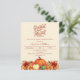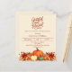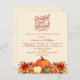 Ein zarter, beige Hintergrund. Die Einrichtung ist mit Kürbissen und orangen und gelben Blumen geschmückt. Personalisieren Sie die Party-Details und fügen Sie sie hinzu. Text-Skript: Dankbar und gesegnet. 1 Blatt = 1 Einladung mit Druckkante bis Kante.
