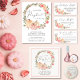 Eine niedliche, preisgünstige Babydusche mit "ein süßer Kürbis ist auf dem Weg", geschrieben in sanft grauer Typografie und einer Korallenschrift mit Wimpern, und einem Aquarellkranz mit pastellrosa und korallenfarbenen Kürbissen und Blumen. Der Name der Mutter lässt sich einfach in einem stilvollen Korallenbild und den Duschdetails in einer einfachen, weichen, grauen Typografie personalisieren.