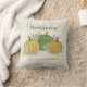 Dieses Design zeichnet sich durch ein Zuhause-Wohnen, Wasserfarbkürbis individuelles Kissen, mit glücklicher Danksagung Typografie, ein Herbst-Wohngestaltung-Design mit rustikalem Bauernhaus, orange und grün, botanisches Blatt Design, vollkommenes Herbst-Boho, Blumendekoration, mit Kalligraphie-Schrift.