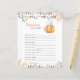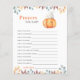 "Ein kleiner Kürbis ist unterwegs. Feiern Sie mit diesem Baby Cartoon Kürbis Thema für Baby Dusche Party! Wasserfarbener niedlicher Cartoon Kawaii Kürbis mit Herbstmütze (Kappe) und Herbstlauben. Auf der Rückseite der Karte befinden sich Herbstblätter.