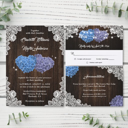 Rustic purple and blue wedding paper napkins featuring floral hearts, string lights and white floral lace against a barn wood background.