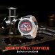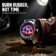This bold watch face features a vintage-style purple hot rod car, its lower half engulfed in vibrant orange and yellow flames, appearing to speed across a dark, reflective road. The black background emphasizes the intense motion and fiery elements of the car, creating a powerful and dramatic design for automotive enthusiasts.
