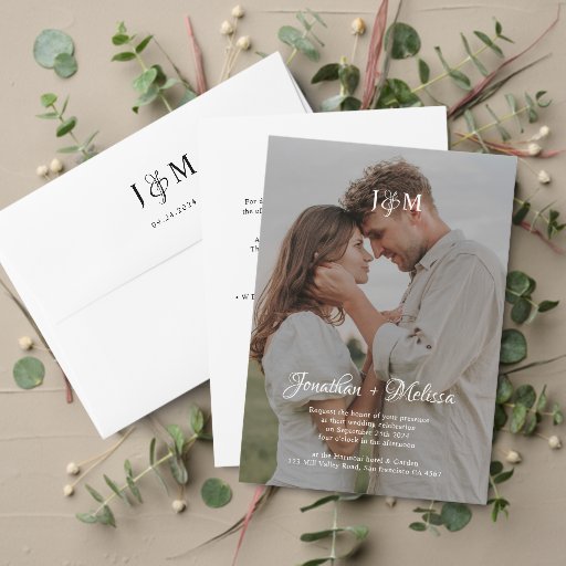 QR Code Budget Monogram Script Foto Hochzeit Einladung