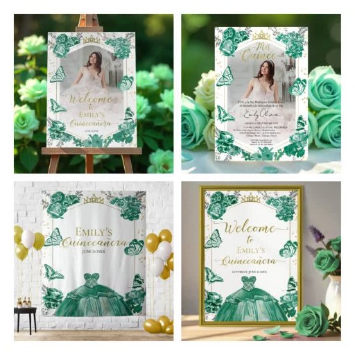 Die Einführung des Golded Tiara Geometric Frame Quinceanera Seating Chart Sign mit einem atemberaubenden smaragdgrünen Blumendesign und Schmetterlingdesign. Dieses elegante Stück ist leicht zu personalisieren und ist somit eine perfekte Ergänzung zu Ihrem besonderen Fest. Dieses von CaMiDesigns entworfene Schild mit Sitzplätzen wird Ihre Gäste bestens führen und gleichzeitig die Dekoration Ihrer Veranstaltung verbessern. Für Unterstützung bei Bestellungen, Versand, Produktinformationen und vielem mehr wenden Sie sich bitte direkt an den Zazzle Kundenservice.