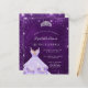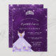 Eine moderne, stilvolle und glamouröse Einladung zu einer Quinceañera, 15. Geburtstagsfeier. Ein tiefer lila Hintergrund mit Imitaten Glitzer Staub, ein Tiara und ein Kleid. Die lila Farbe ist ungleichmäßig. Der Name ist mit einem modernen handgeschriebenen Stilskript geschrieben. Personalisieren Sie Ihre Party-Daten und fügen Sie sie hinzu.