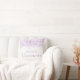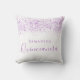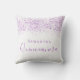 Ein Kissen für eine Quinceañera, 15 Jahre alt Mädchen Zimmer. Ein schick weißer Hintergrund mit lila Imitaten Glitzer fällt, Flecken. Der Text: Quinceañera ist in lila mit einem großen, modernen Schrift geschrieben. Personalisieren und einen Namen hinzufügen.