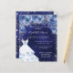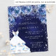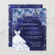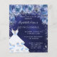 Eine moderne, stilvolle und glamouröse Einladung zu einer Quinceañera, 15. Geburtstagsfeier. Ein marinierter Hintergrund mit Imitaten silbernen Glitzer Glitzern, ein Kleid und blauen Rose, Blumengestühle. Die blaue Hintergrundfarbe ist ungleichmäßig. Der Name ist mit einem modernen handgeschriebenen Stilskript geschrieben. Personalisieren Sie Ihre Party-Daten und fügen Sie sie hinzu.