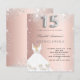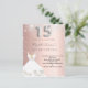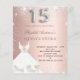 Eine moderne, stilvolle und glamouröse Einladung zu einer Quinceañera, 15. Geburtstagsfeier. Eine Rose goldener Hintergrund mit Imitaten silber Glitzer Staub und ein Kleid. Der Name ist mit einem modernen handgeschriebenen Stilskript geschrieben. Nummer 15 wird mit einem Ballon-Stift-fon geschrieben. Personalisieren Sie Ihre Party-Daten und fügen Sie sie hinzu.
