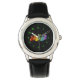 Watch with illustration of rainbow dragons in the colors of the LGBT (lesbian, gay, bisexual, and transgender people) rainbow stripes pride flag, fantasy design on black background