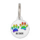 Cartoon-Hundepapiere mit Regenbogenfarben. Alles, was gesehen wird, ist gedruckt. Bei der Herstellung wird keine eigentliche Prägung verwendet. Bearbeiten Sie den Namen in der Vorderseite und die Telefonnummer auf der Rückseite, um diese ID-Tags personalisiert zu machen.