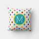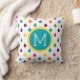 Dieses niedliche Kissen ist mit einem hellen, roten, orangefarbenen, gelben, grünen, blauen, lila, rosafarbenen und auf Weiß aquamarinen Gewand geschmückt. Personalisieren Sie das passende aquamarine und gelbe Monogramm mit Ihrer Wahl des Initials.
