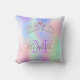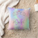 Ein Kissen für ein mädchenhaftes Zimmer für einen Sweet 16 oder Quinceañera. Ein trendiger Regenbogen, holografischer Farbverlauf mit lila, rosa, goldfarbenem Rose und Minzgrün. Personalisieren und fügen Sie einen Namen und einen Monogrammbuchstaben hinzu. Der Name ist grau geschrieben mit einem modernen handgeschriebenen Stil. Der Monogramm-Brief in lila. Ein großes rosa und Imitate silberne Tiara, Krone.