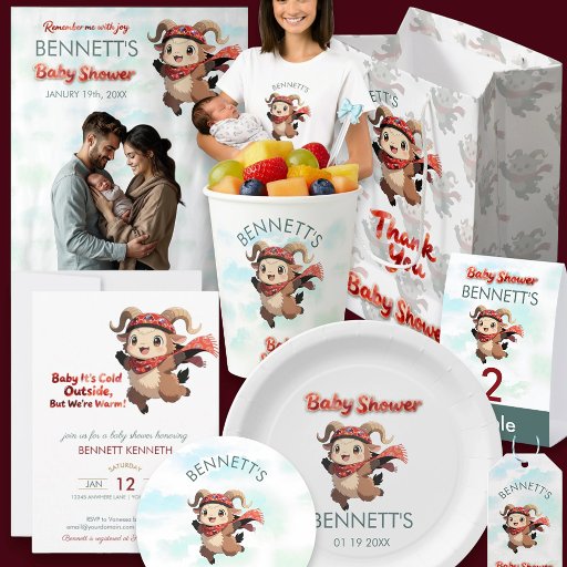 This personalized wrapping paper is special because it features an all-over, repeating pattern of the adorable winter ram character. The pattern incorporates the ram graphic and the personalized "Thank You Baby Shower" text, creating a distinctive, whimsical, and fully coordinated way to wrap gifts for the parents or to send guests home with wrapped favors.
