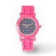 Eine hübsche Kids Pink Glitzer Strap Watch, mit einem farbenfrohen Muster von Rot und Rosa Blume und Gelben Polka Dots auf einem tiefen, blauen und grünen Hintergrund. Als Teil der Posh & Painterly 'Rangoli' Kollektion kann dieses Muster an jede Armbanduhr angepasst werden.