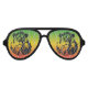 Schwarze Silhouette Löwe Kopf über einer rasta farbenen Sonnenbrille in Rot, Gelb und Grün