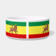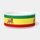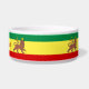 Diese Haustierschüssel kennzeichnet ein Rasta Reggaethema mit der Flagge von Äthiopien horizontaler Bands 1897 Bestehens des Grüns, des Gelbs und des Rotes mit einem dunklen Löwe von Judah in der Mitte, trägt eine Krone und hält ein Kreuz.