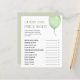 Mit unserem "Guess The Price Right" Green Balloon Boy Baby Shower Game können Sie sich mit Lachen und Spielfreude auf Ihre Babydusche freuen! Eine lustige Art, die Fähigkeiten Ihrer Gäste über Babys zu testen! Holen Sie sich noch heute Ihre und schaffen Sie unvergessliche Erinnerungen!