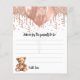 Für eine Babydusche. Ein stilvoller weißer Hintergrund. Dekoriert mit Rose Gold, rosa Tropfen, Malertränke, Party-Bänder, Ballons und einem niedlichen Teddybär.