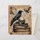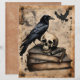 This scrapbook paper seems to be a page from a book of magic--an old parchment sheet with a raven perched on a skull on a stack of old books, with faded text, and drawings of another raven and skull. Wonderfully arcane Gothic imagery! The back is a plain, grungey paper texture, without images or text.