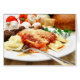 Der Käse Ravioli mit parmeseischem Käse übersprinkled, kleine Fleischbällchen auf der Seite. Frisches Gemüse, Käse und Brot im Hintergrund.