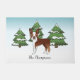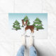 Desteis originelle Cartoon-Illustration einer niedlichen Rot-Weiß-Rasse Boston Terrier. Der Hund ist in einer Winterlandschaft mit drei grünen Tannenbäumen und fallendem Schnee untergebracht. Der Hintergrund ist ein blaues bis weißes Gefälle, das das Design des kalten Wintertages verleiht. Es gibt auch einen personalisierbaren Textbereich für einen Namen.
