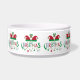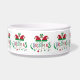 Niedliche rote und grüne Weihnachtsmannmütze Weihnachtsglocken Weihnachtshund oder Katze fütternd oder Wasserschalen.