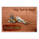 Ein roter Kangaroo-Buck mit einem traditionellen australischen Hut, Erholungen in der Wüste. Es erscheint auch ein Plakat mit Textlesen, "Australien" in einem Stil, der an die Barkmalerei der Aborigine erinnert. Fügen Sie Ihren eigenen zusätzlichen Text hinzu. Der Rote Kangaroo (Macropus rufus) ist die größte Känguruart und Australiens größtes Landtier.