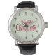 Eine Armbanduhr mit extravagantem typografischem Design mit einem festlichen Schriftart in Rot, der frohe Weihnachten sagt.