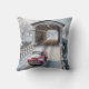 Ein roter Vintager LKW fährt über eine schneebedeckte Brücke, umgeben von einer winterlichen Landschaft