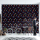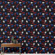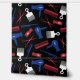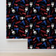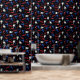 Tapete im Friseursalon mit roten, weißen und blauen Mustern verschiedener Friseurwerkzeuge, wie Scheren, Kämme, Haartrockner, Haarschneider mit schwarzem Hintergrund. Friseursalon mit gemusterten Tapeten in Rot, Weiß, Blau und Schwarz. Tapete mit Friseurwerkzeugen und Haarschneidwerkzeugen in rot, weiß und blau vor schwarzem Hintergrund