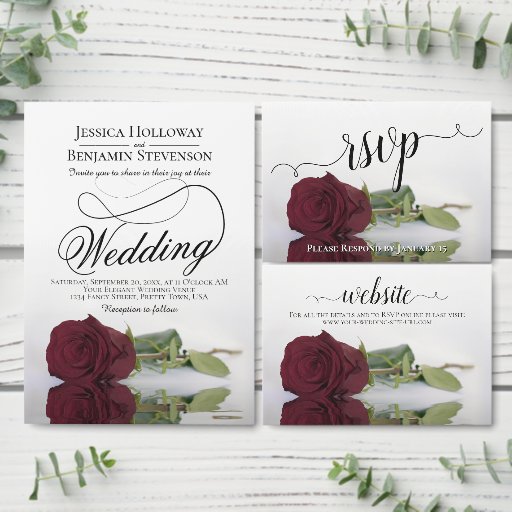 Diese schöne RSVP-Karte wird es Ihren Gästen erleichtern, auf Ihre Hochzeitseinladung zu reagieren. Das Design umfasst eine schöne bordeauxfarbene, maronfarbene oder weinrote Rose, die sich in einem Wasserbecken mit Wellen und Wellen widerspiegelt, und einen laksigen Schriftzeichen-Titel. Die Rückseite ist so gestaltet, dass Ihre Gäste Platz zum Ausfüllen und Zurückkehren haben, um ihnen die Wahl der Mahlzeiten sowie die Anzahl der Gäste, die anwesend sein werden, mitzuteilen.