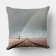 Foto Throwkissenkissen mit einem Regenbogen und dunkle Wolken während eines Frühlinges stürmen über einer Landschaft mit einer alten Windmühle und rosa Hyazinthen-Blumen in der niederländischen Birnen-Region in den Niederlanden.