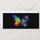 Regenbogen, leuchtend, künstlerisch bemalt Monarchen Schmetterling mit einem Bouquet aus glänzenden, hellen, leuchtenden Rose auf schwarzem Hintergrund. Regenbogenschmetterling.