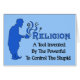 Ein Magier spuckt die Symbole der bedeutenden Religionen von seiner Laterne und ist mit dem Sprichwort "Religion, ein Werkzeug illustriert, das erfunden wird durch das starke zur Kontrolle das dumme."