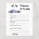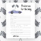 Race Car Thema Baby Dusche Einladungskarte mit Aquarellbildern eines lila (violetten) Vintage Autos und schwarz - weiß Rennen Flagge. "Renn um eine Babydusche."