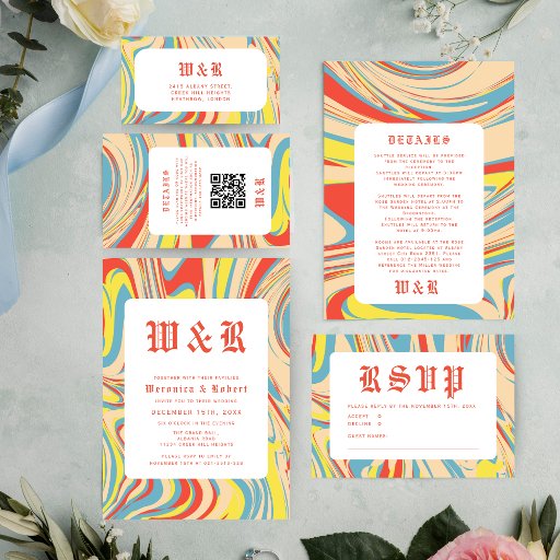 Fusion von Retro und modernen Designs mit wirlem Marmor abstraktes Muster mit alten englischen Schriftart Monogramm und Bogenrahmen personalisierte Hochzeitseinladung. Orangefarbene, gelb-blaue und rosa Farbpalette laden zum Verweilen ein. Diese Karte ist leicht editierbar. Wenn Sie Hilfe bei der Anpassung dieses Produkts benötigen oder mehr passende Produkte für diese Sammlung benötigen, senden Sie mir bitte eine Nachricht über Zazzle.