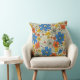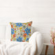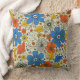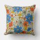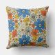 Dieses quadratische Kissen hat ein Retro-Blumenmuster mit Blume und Blätter in Orange-, Blau- und Gelbtönen.