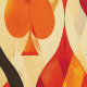 Dieses Kunstwerk zeichnet sich durch ein gewagtes und lebendiges Muster aus, das von klassischen Kartenspielkarten-Anzügen wie Herz, Pik, Diamanten und Clubs inspiriert wird. Das Design beinhaltet diese ikonischen Symbole in länglichen, teardrop-förmigen Formen, Set gegen einen warmen, Gradienten Hintergrund von Rot, Orangen und Gelb. Die stilisierten Anzüge sind in Schwarz und Rot umrissen und bilden einen auffallenden Kontrast, der die dynamischen Formen und Farben unterstreicht. Die sich überlappenden Elemente und die Vintage Textur rufen ein nostalgisches Gefühl hervor, das modernes Design in der Mitte des Jahrhunderts mit einer spielerischen Drehung verbindet.